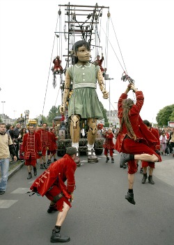 What a marvelous idea. I so wish I lived closer so that I could attend all their productions. Great photos! I love the giant girl walking on the street!