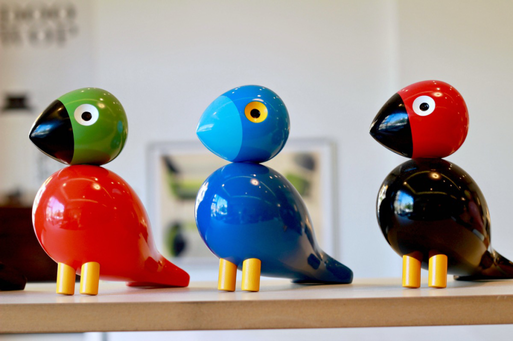 Main photo caption: The six “Songbirds” created by Danish designer Kay Bojesen in the 1950s each has a name. Above, from left to right: Pop (after soda pop), Kay (after the designer himself), and Peter (after Bojesen’s eldest grandchild).