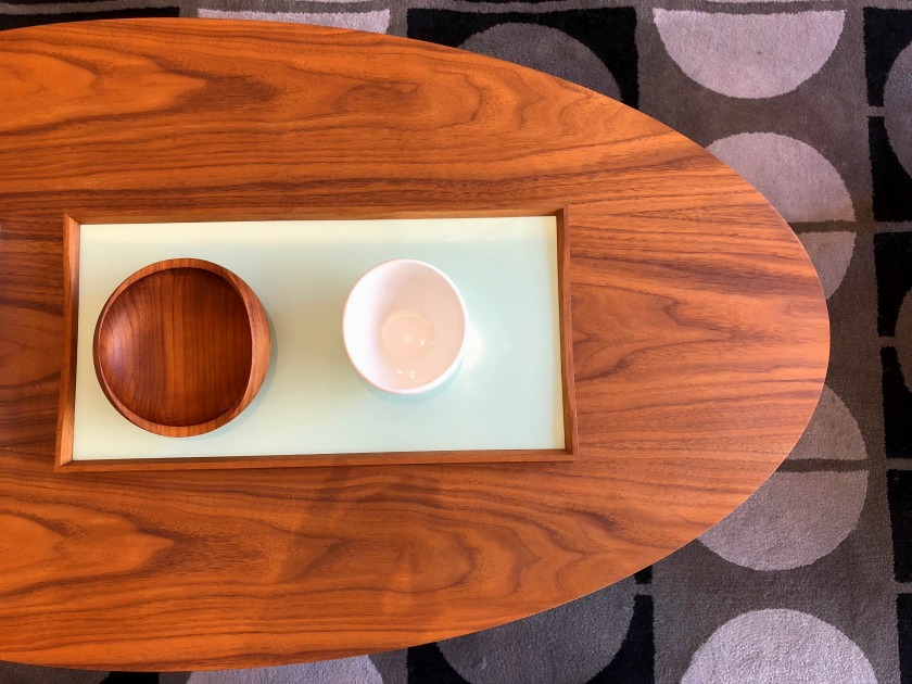 White porcelain sugar bowl from the Finn Juhl Essence range (1952) produced by ArchitectMade sits atop the two-sided teak FJ Turning Tray (1956) to the right of the FJ teak bowl (1951). The Ovalette Table by Ilmari Tapiovaara (1954) sits on Finn Juhl’s Circle Rug (1963).