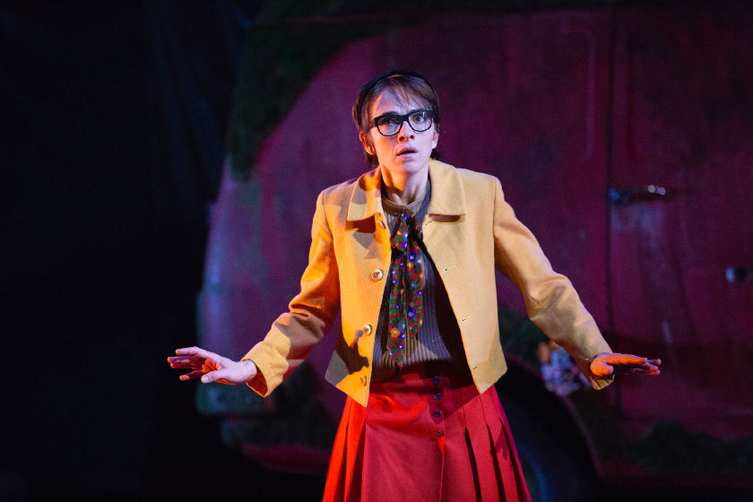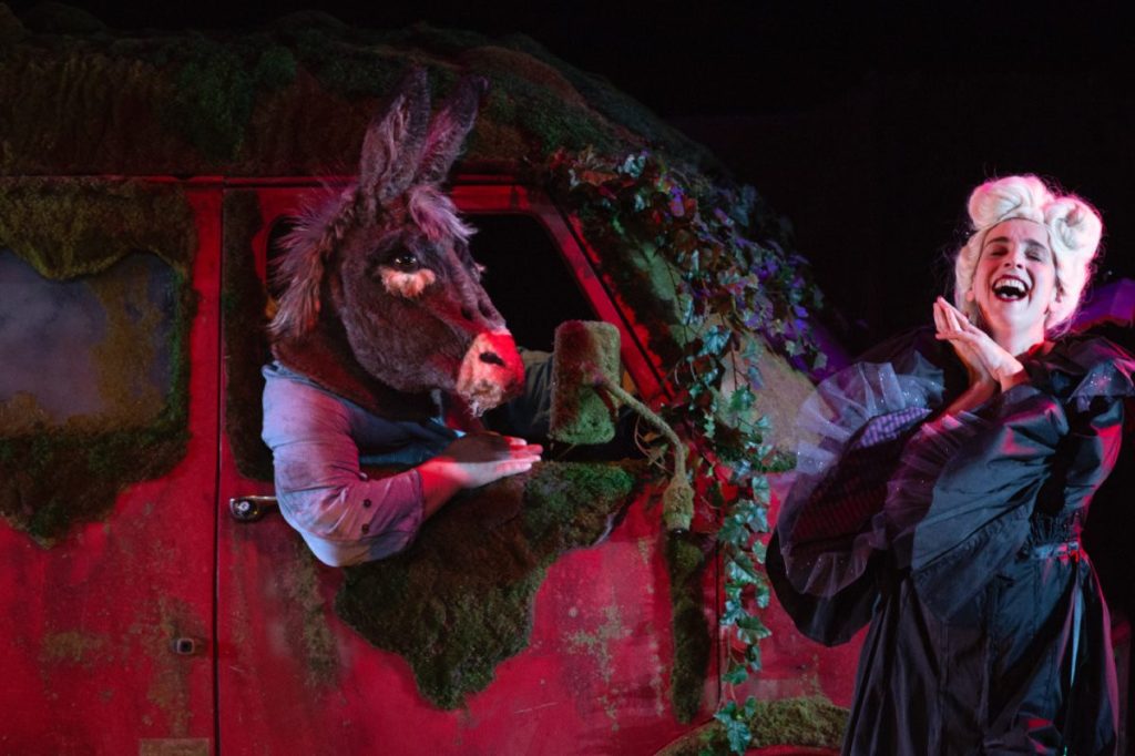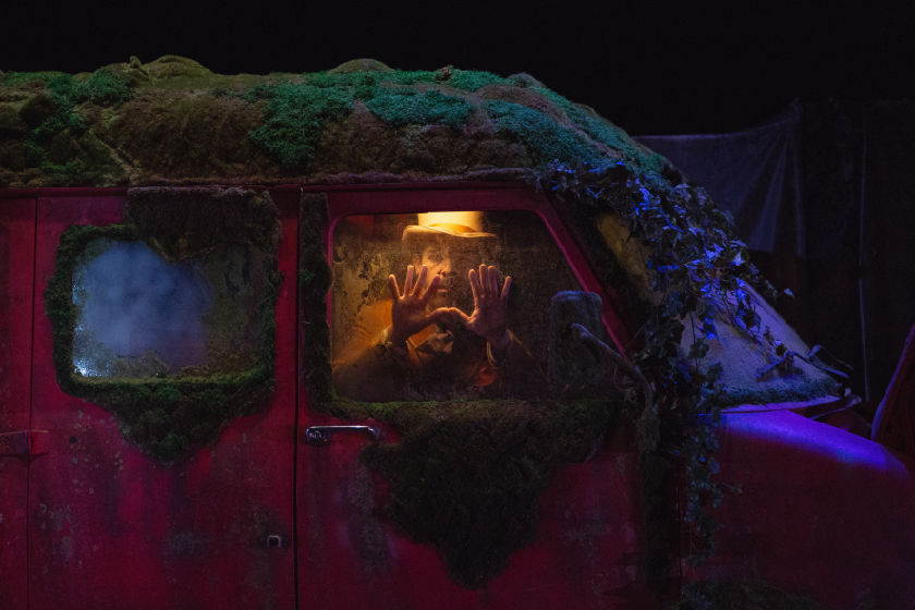 As with “Shake“, his adaptation of Shakespeare’s Twelth Night for the 2016 Edinburgh International Festival, which was set in a 1970s seaside holiday resort complete with beach huts, Jemmett places “Je Suis Invisible!” in Shakespeare’s classic forest setting but one that also serves at one point as a modern-day campsite complete with sleeping bags, and a vibrant coral-pink camper van, the source of much hijinks and the comings-and-goings of the central characters.