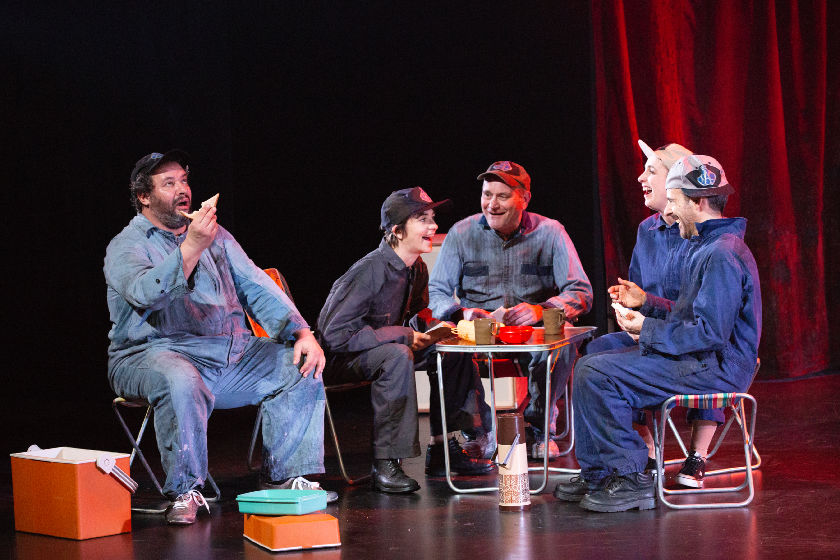 Shakespeare’s “mechanicals”, literally mechanics in this production, make plans to put on a play. Photo: ©Sandy Korzekwa.